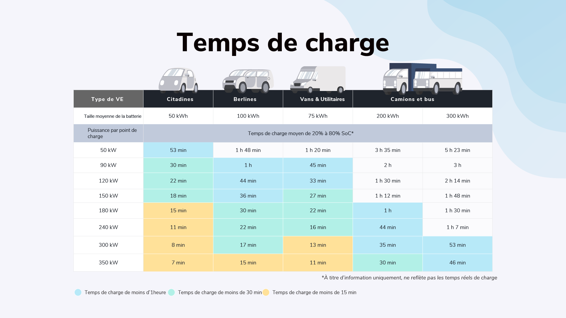 La taille de la batterie d’un véhicule a un impact sur le temps de charge. Par exemple, si vos clients sont principalement des conducteurs de bus électriques dotés de grandes batteries, vous devez tenir compte du fait que même s’ils restent moins longtemps, ils ont besoin d’une plus grande puissance de sortie.